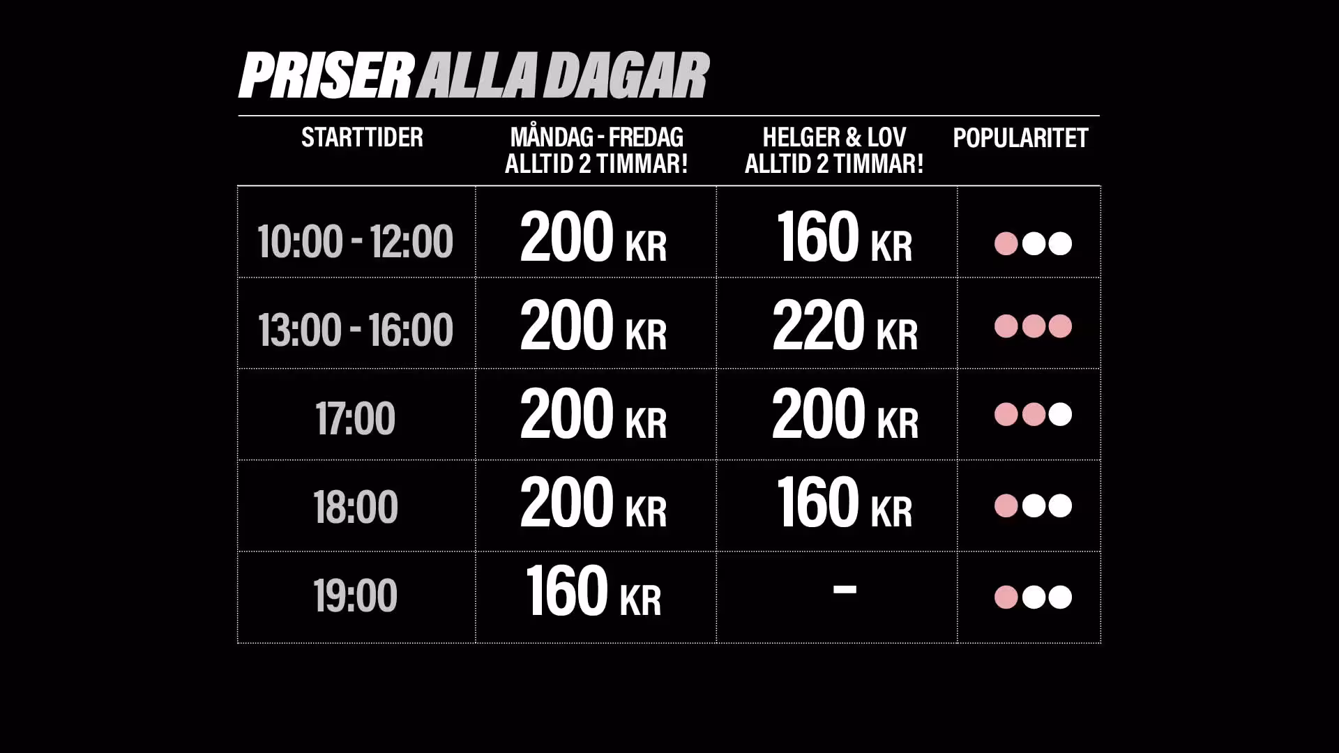 Flexibla priser – På våra mindre besökta tider får du ett mer förmånligt pris. Passa på att besöka oss när vi har det lite lugnare!