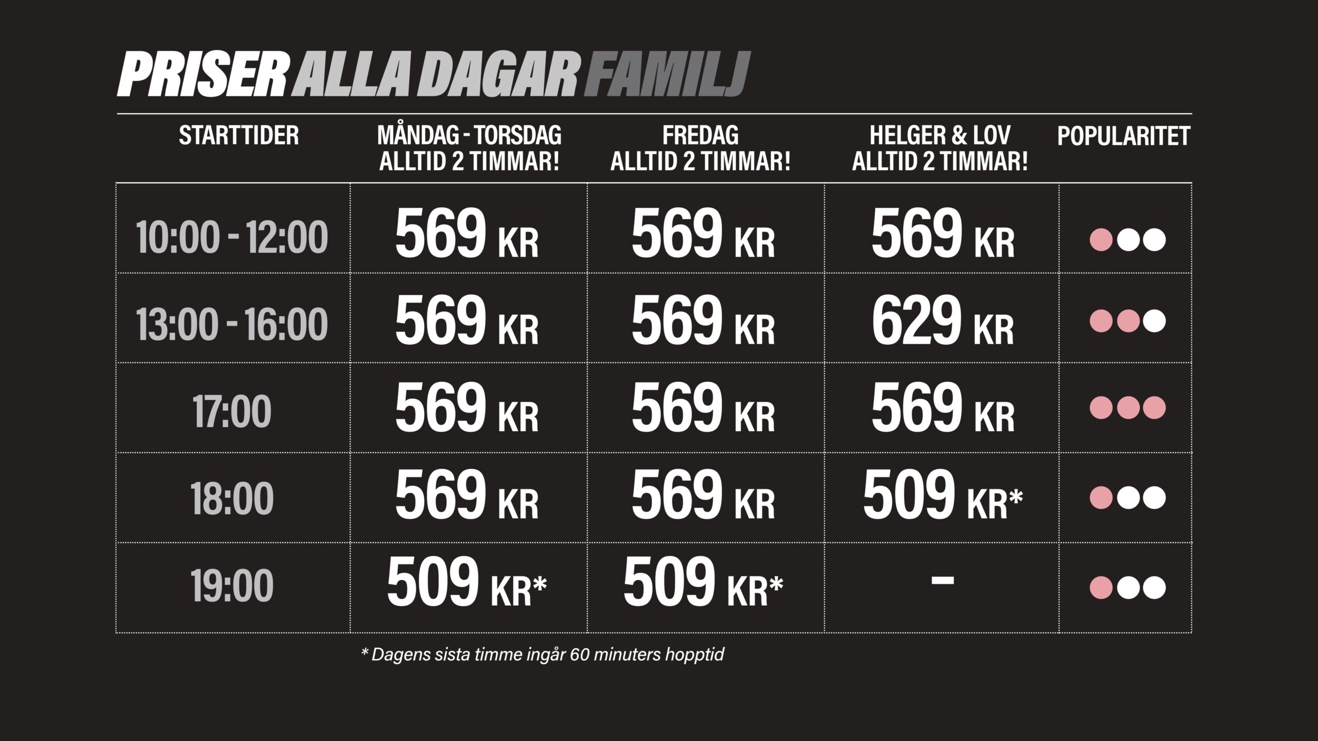 Familjebiljett – Med vårt familjeerbjudande hoppar familjen i 2 timmar till rabatterat pris! (4 personer till priset av 3, varav minst 1 över 18 år).